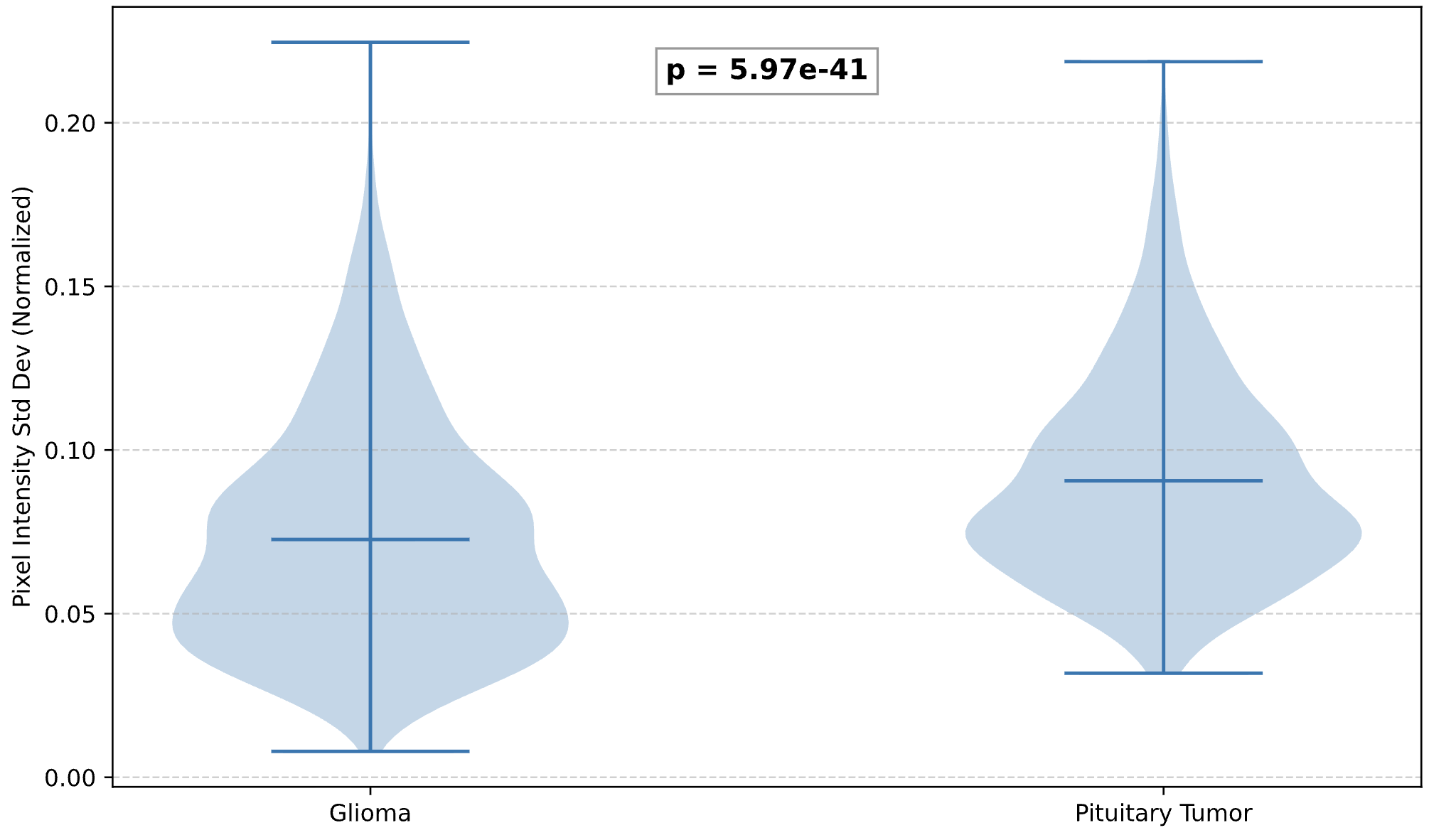 One standout finding was different. AutoDiscovery hypothesised that pixel intensity heterogeneity would be significantly higher in gliomas than pituitary tumours, reasoning from necrosis and vascular heterogeneity. Prior belief: 0.96. The data found a significant difference (Mann-Whitney U, p = 5.97 × 10⁻⁴¹), but in the opposite direction — pituitary tumours showed higher heterogeneity (0.0906 ± 0.0316 vs 0.0727 ± 0.0346). Belief dropped to 0.327. Surprisal: -0.759. Not wrong in the sense of a failure, but wrong in the sense that matters for science: evidence meaningfully shifting expectations.